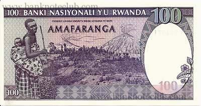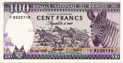 Beautiful crisp-uncirculated 100-Francs Note from central Africa's Rwanda, picturing a group of zebras on front - and on back, a native women with infant, against a backdrop of active volcanos. Measures approximately 5-1/4" x 3", and comes in a clear protective currency sleeve.
